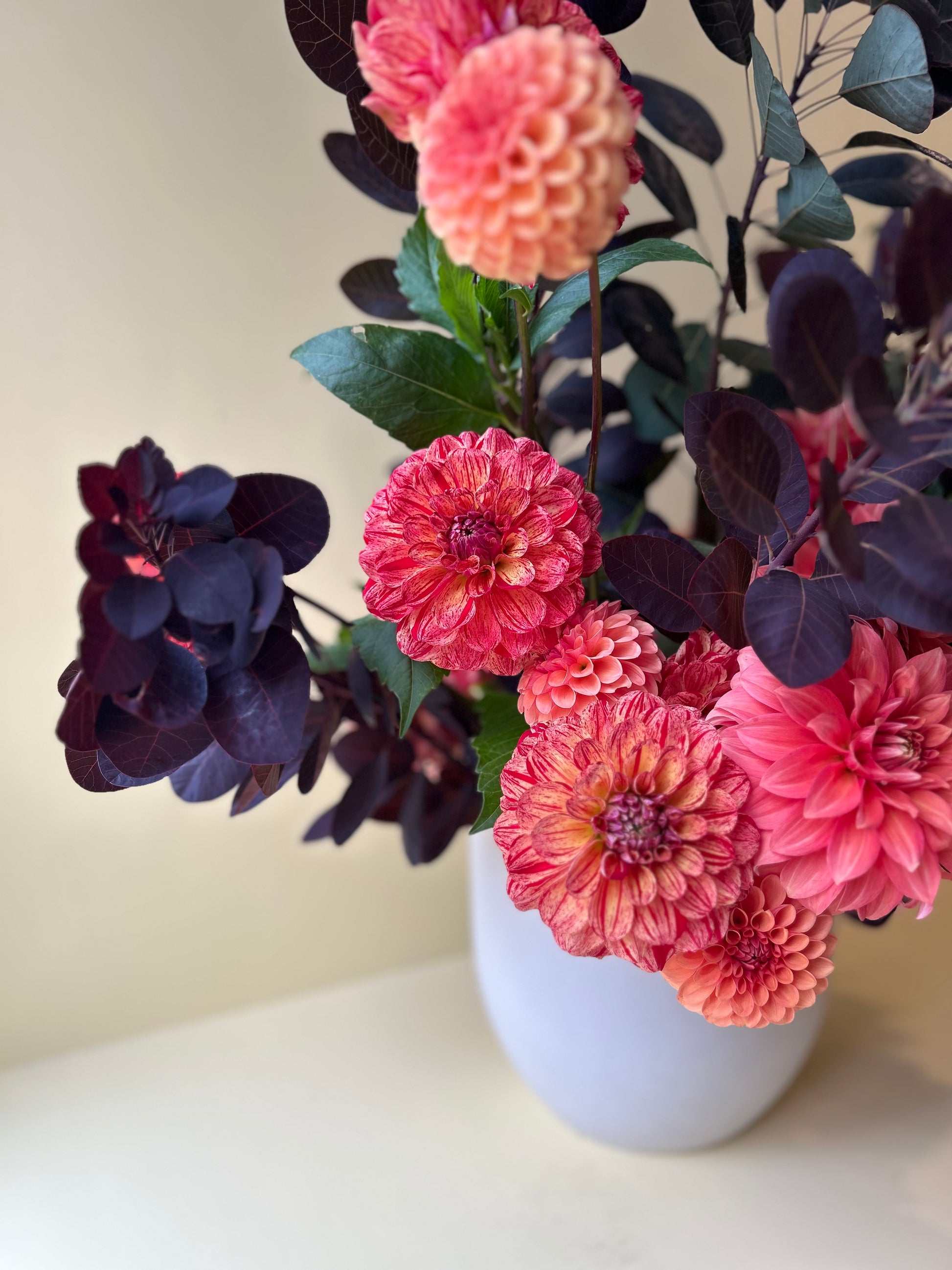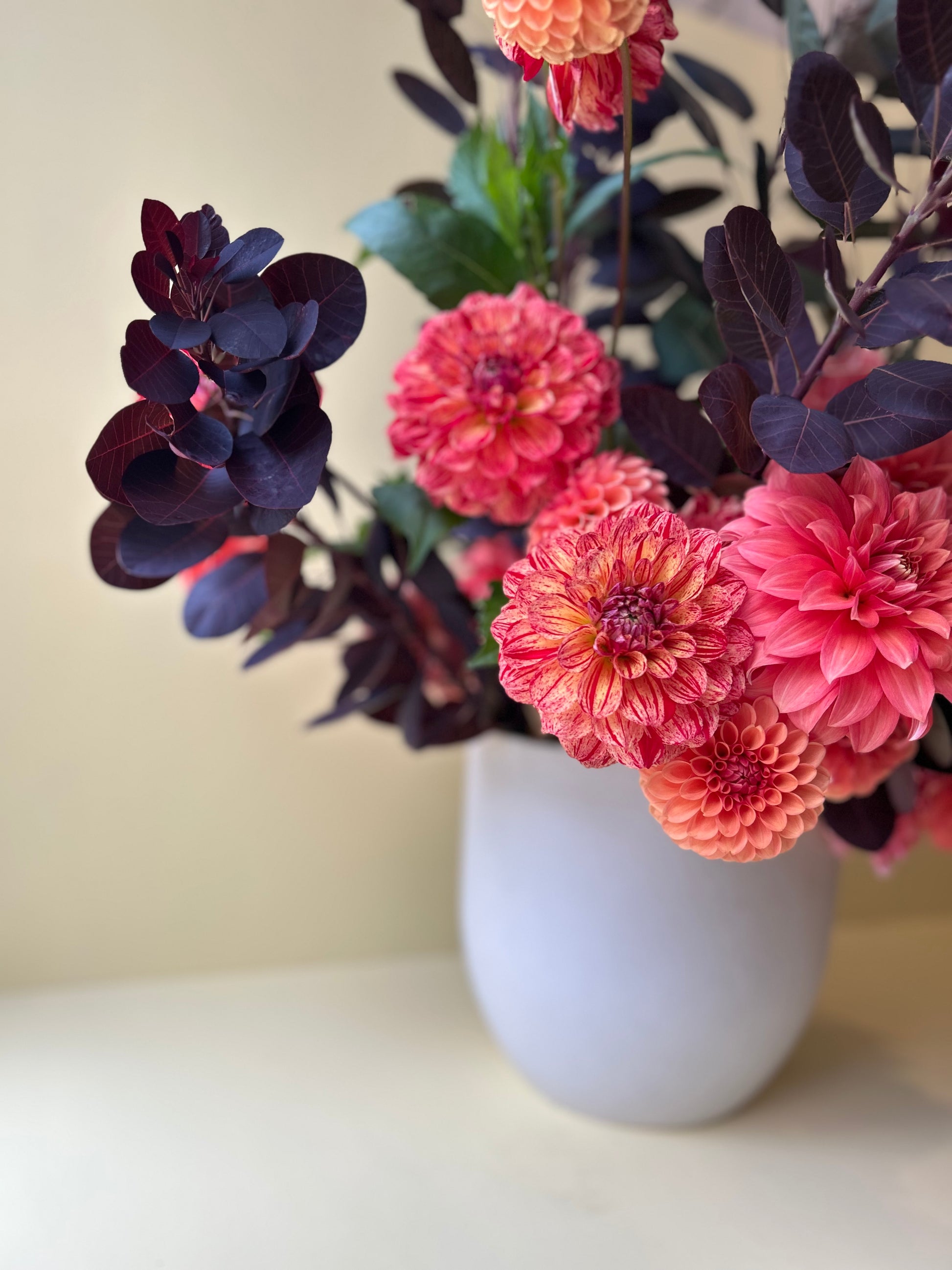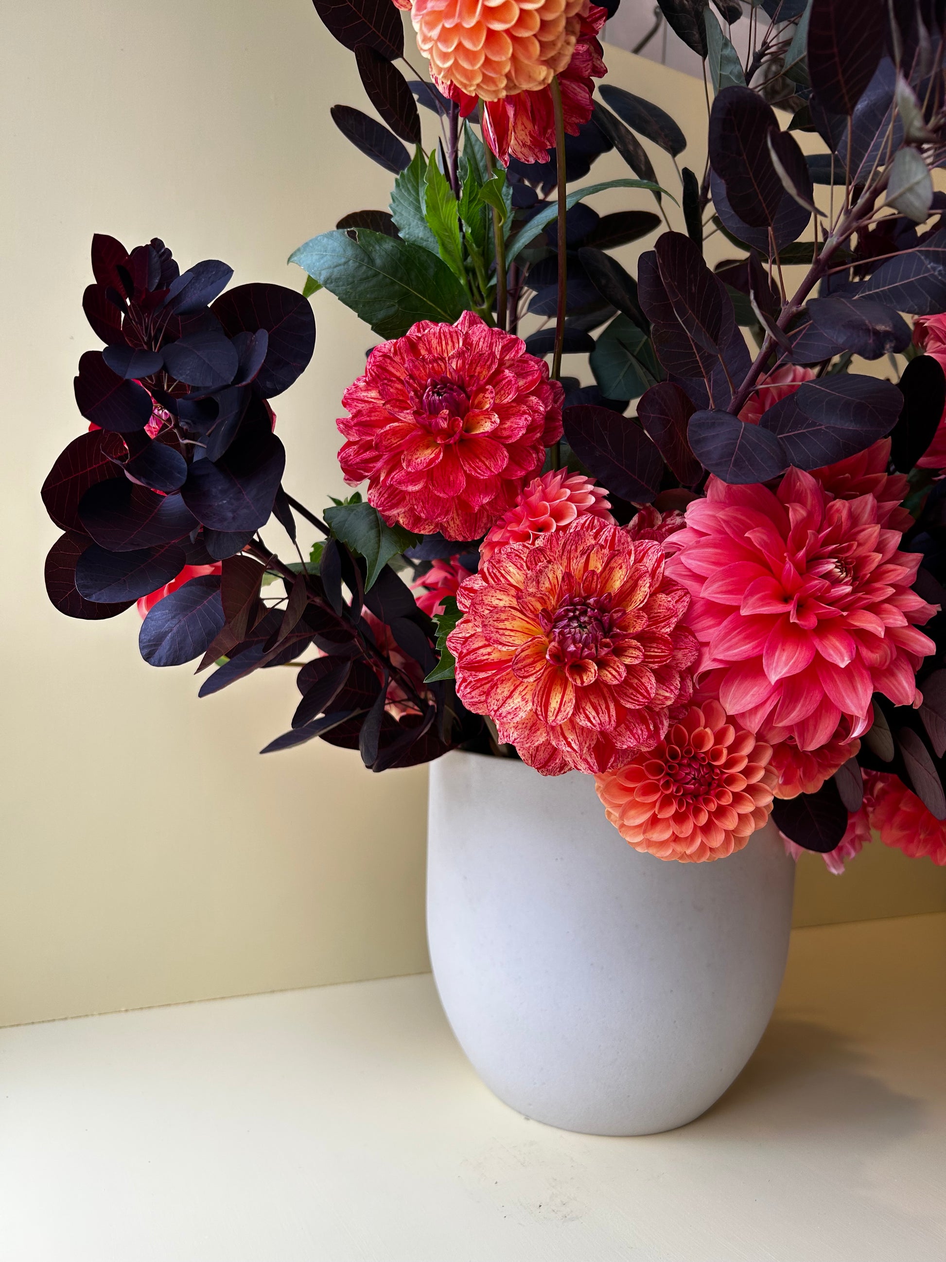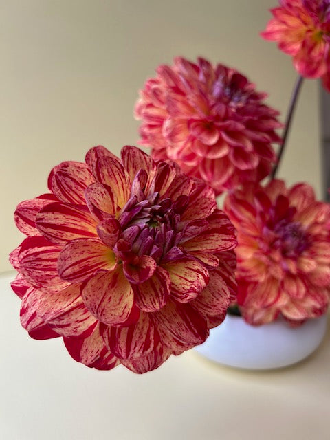 A striking decorative with red boiled candy-like stripes and segments on a pale yellow base. Blooms grow on a strong beast of a plant that provides stunning feature foliage when arranged in a vase.