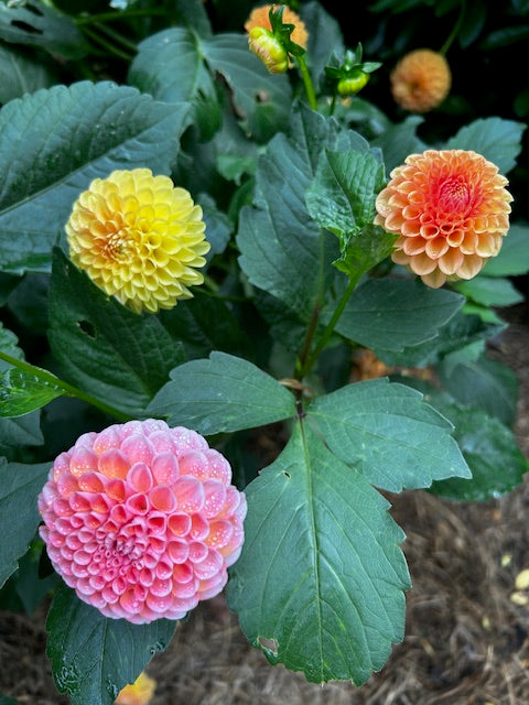 The colour-changing, shimmering elf. She's a beautiful ball dahlia and a prolific producer of blooms. A warm peach dahlia, changing to light orange and pink throughout the season. She even throws the odd pink petal in the middle of a sea of orange and positively sparkles like glitter after a morning dew. Great as a cut flower and super multiplier of tubers.