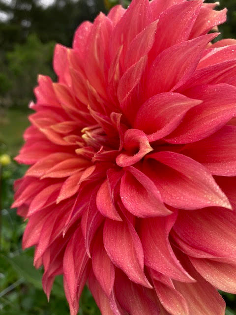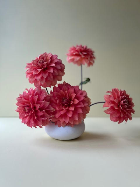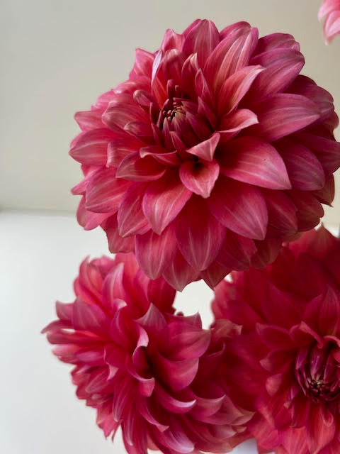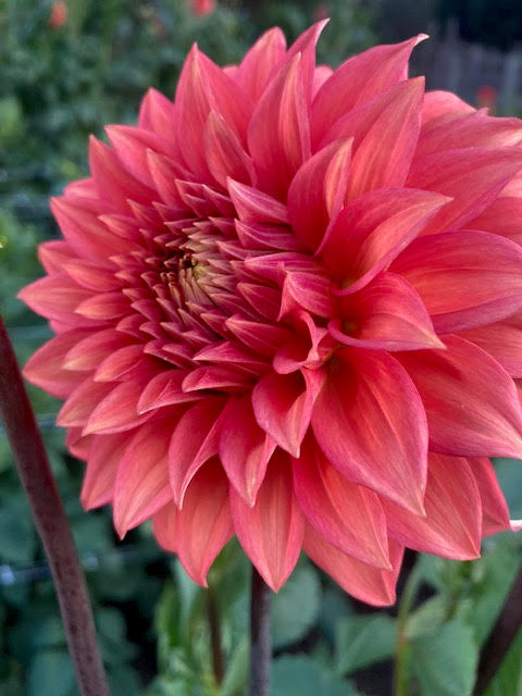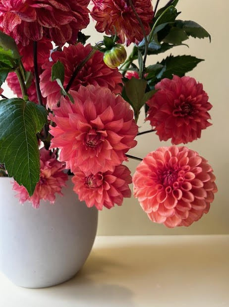 A beautiful salmon decorative who often develops some sweet pink lines in her petals. She's an absolute crowd-pleaser, a plumper of bouquets, a happy addition to every garden.